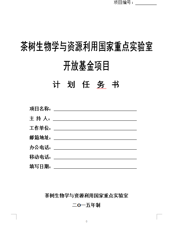 茶树生物学与资源利用国家重点实验室开放基金项目计划任务书(模板)