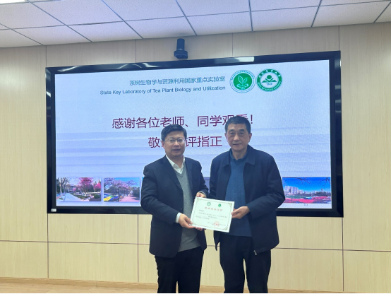 报告结束后,实验室主任宛晓春教授代表茶树生物学与资源利用国家重点实验室为刘源教授团队颁发学术报告荣誉证书。