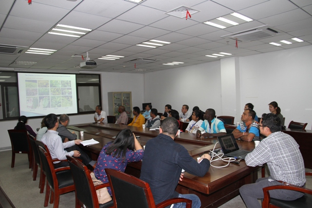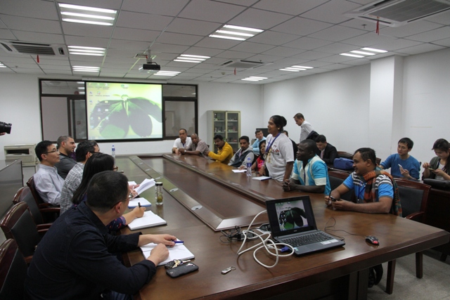 4月13日下午,由我校协办的“2016年发展中国家进出口农产品检验检疫技术人员培训班”,组织来自埃及、加纳、斯里兰卡、津巴布韦、乌兹别克斯坦、土耳其等国家的16名技术人员来室交流,国家重点实验室常务副主任韦朝领、专职副主任沈周高、谢忠稳教授、邓威威博士和王一君博士等参与了此次交流活动。中外双方参会人员逐一自我介绍之后,谢忠稳教授着重介绍了茶叶营养生理与健康分子机制团队在茶与健康方面的研究进展,引起外国友人浓厚的兴趣,对我国传统饮品-“茶”有了更进一步的了解。