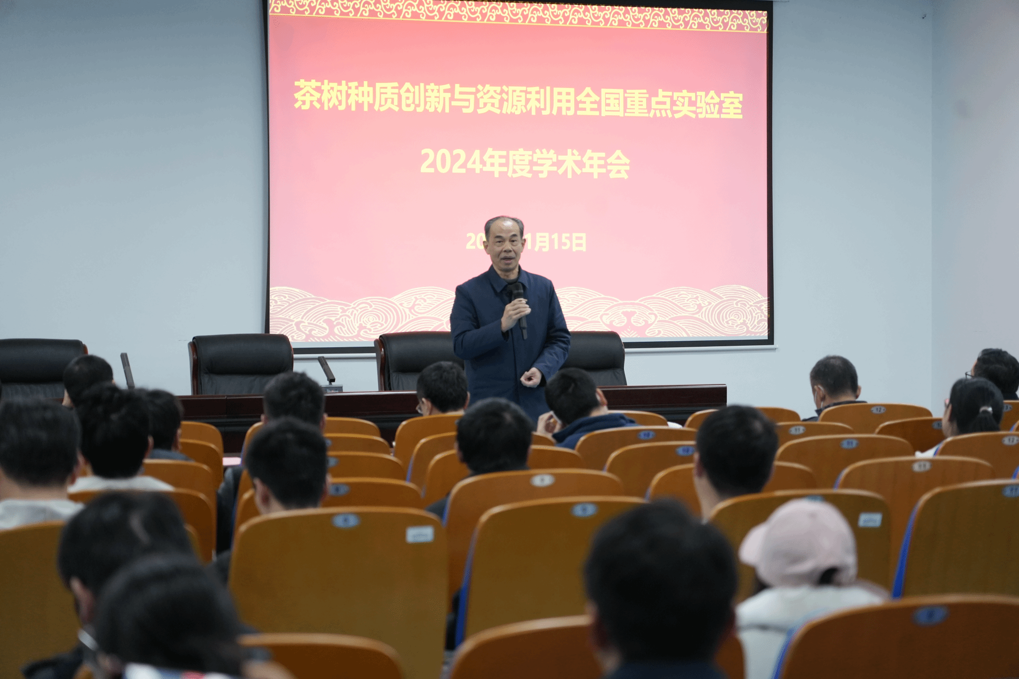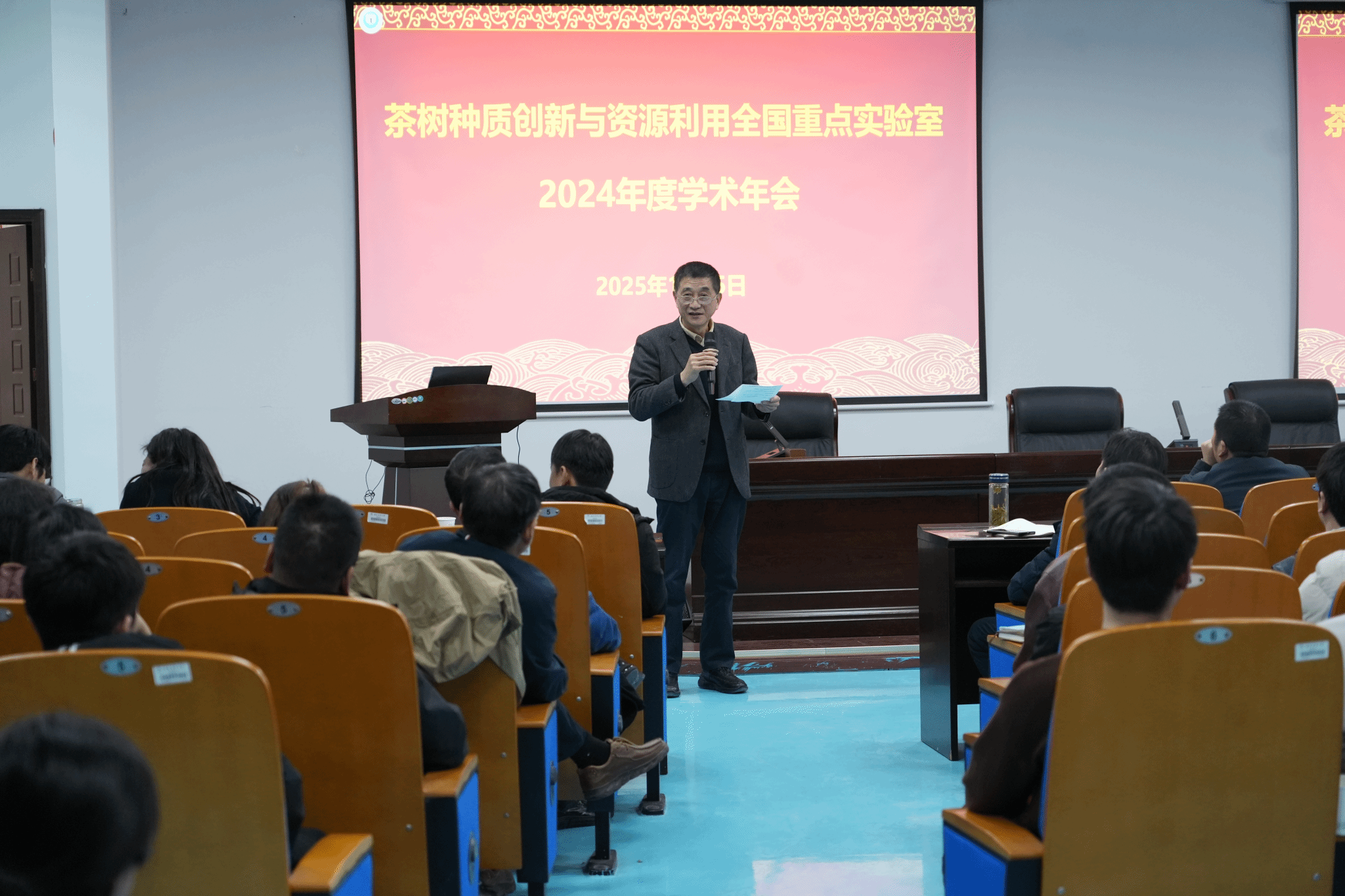 本网讯 1月15日,安徽农业大学茶树种质创新与资源利用全国重点实验室重组获批后首次学术年会在生物科技楼召开。本次学术年会共计安排26场报告,实验室常务副主任韦朝领全面介绍了2024年度实验室的整体建设情况。各团队PI从科研成果、学术交流、人才培养、服务产业等方面作了汇报。李大祥、韦朝领、宋传奎、张照亮、邓威威等分阶段主持了会议。
