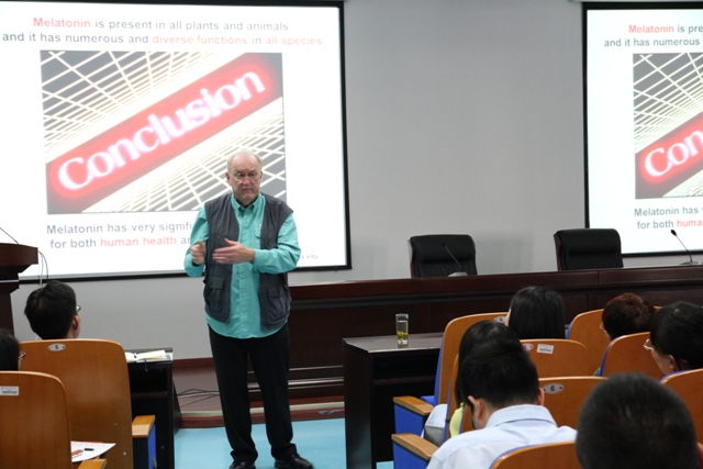 2015年5月18日上午,美国德州大学健康医学中心细胞生物学系Russel J. Reiter教授应邀到实验室进行学术访问和交流。并作了“植物褪黑素及其抗逆性研究”的学术报告。本次报告会由实验室常务副主任韦朝领教授主持。
