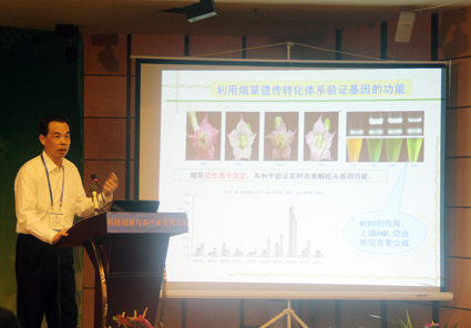 夏涛教授主持了大会的开幕式。中国茶叶协会名誉理事长陈宗懋院士、浙江大学梁月荣教授和夏涛教授应邀分别做了“科技创新对茶产业发展的作用”、“茶叶良种及其栽培发展趋势”和“生物技术在茶树次生代谢研究中的应用”等精彩报告。分组报告中,韦朝领教授和杨华博士分别作了题为“与茶尺蠖取食诱导相关的miRNA表达分析”、“茶树芽叶不同发育时期比较转录组的研究”等高水平学术报告。