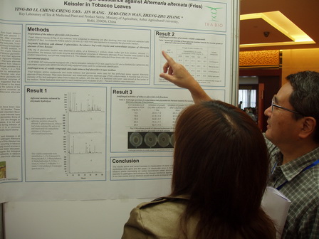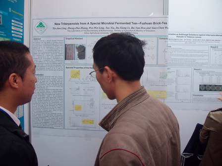 2009年10月16-18日,2009天然产物与传统医药国际会议(ICNPTM , International Conference of Natural Products and Traditional Medicine)在陕西西安召开,实验室选派了青年博士凌铁军、王云生和硕士生姚成程、王瑾等4人参加。会议期间,姚成程同学做了题为《Glycosidically Bound Volatiles as Antifungal Substance against Alternaria alternata (Fries) Keissler in Tobacco Leaves》的英文报告,并与凌铁军博士一起进行研究论文Poster展示。实验室代表团积极与参会专家学者进行广泛交流与探讨,并赢得了国内及国际专家们的关注。