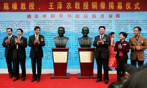 揭幕仪式上,宛晓春同志代表我校致辞,他对关心和支持我校茶学学科发展以及为陈椽教授、王泽农教授铜像捐款的单位和个人表示感谢。他指出,为了缅怀陈老、王老为我国茶业和茶学教育事业做出的杰出贡献,弘扬其高贵品质,在学校80周年校庆之际,特别举行隆重的铜像揭幕仪式。他倡议大家弘扬陈老、王老的严谨治学精神和无私的奉献精神,为茶业和茶学教育事业的发展作出更大的贡献。