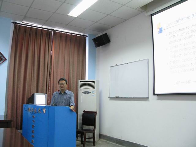 访问期间,芦原教授在茶业楼多媒体会议室为广大研究生和相关教师作了一场题目为“Biosynthesis, Catabolism and Biotechnology of Caffeine in Tea and Coffee”的学术报告。芦原·坦教授系统介绍了近20年来他及其研究组在茶及咖啡中咖啡碱生物合成与代谢研究中所得的重要成果及重大进展。在随后举行的学术讨论会上,宛晓春校长、江昌俊院长、张正竹副院长和相关教师及博士生与芦原教授一行就研究中共同感兴趣的课题进行了探讨与交流,并就今后双方开展课题合作交换了意见。