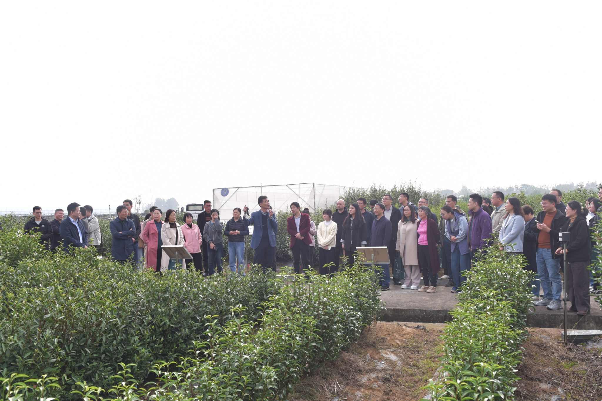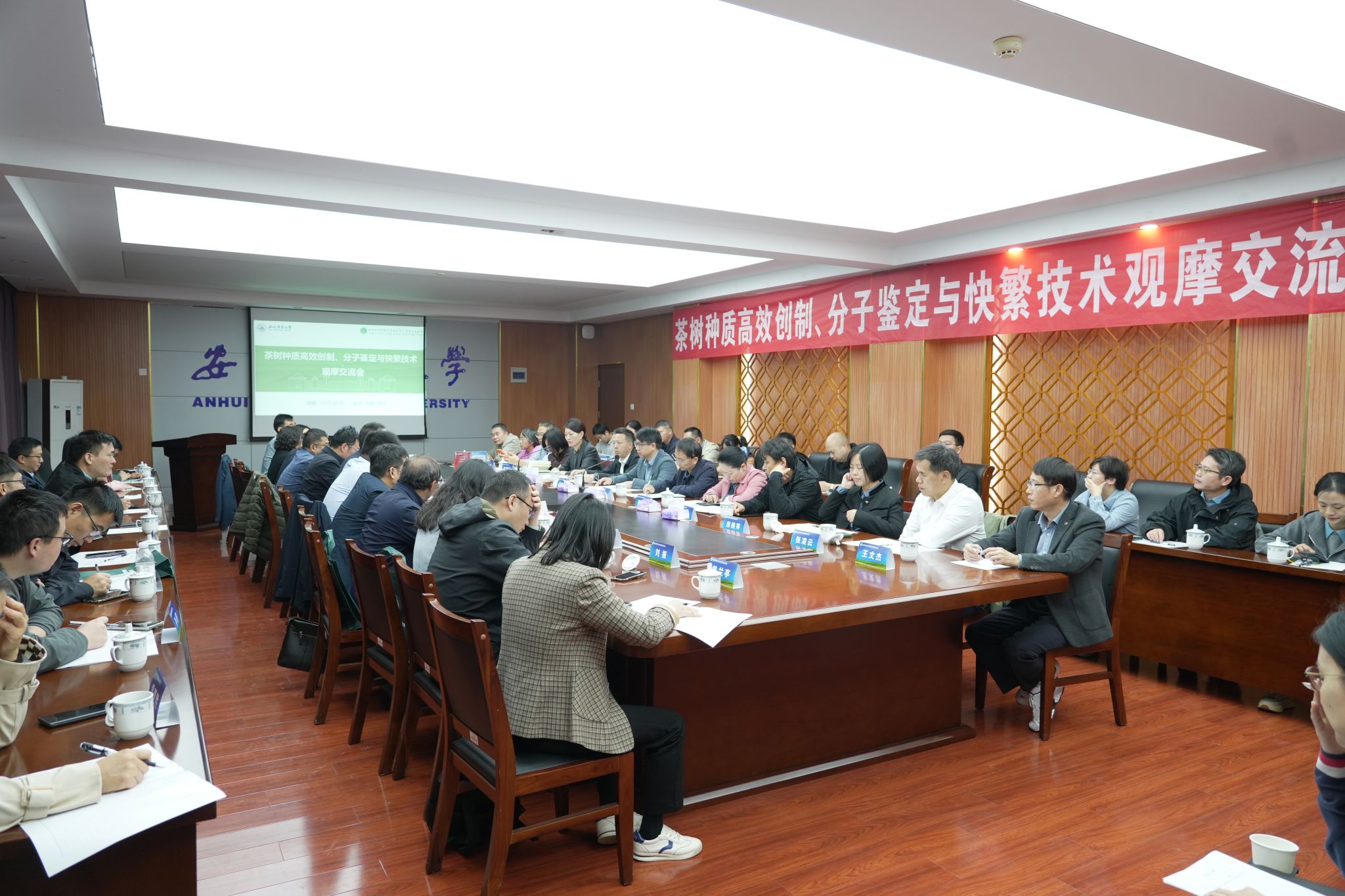 本网讯 2025年10月25日,由实验室韦朝领教授团队研发的“茶树种质高效创制、分子鉴定与快繁技术”成果观摩交流会在皖中综合试验站成功举办。本次观摩交流会由茶树种质创新与资源利用全国重点实验室、国家茶树育种联合攻关组和安徽省茶业学会联合主办。农业农村部种业司资源处、全国农技推广中心品种登记处、安徽省农业农村厅种业管理处和特产处、我校党委常委、副校长吴祥为出席会议,来自包括浙江大学、中国农业科学院茶叶研究所、武夷星茶业有限公司等全国涉茶高校、研究所和企业的33家单位60余人参加。会议由校科技处处长赵冠艳主持。