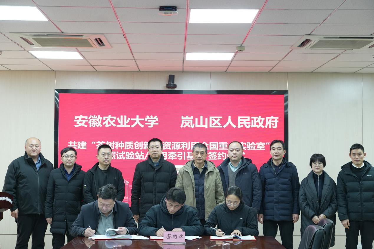 本网讯1月23日,日照市岚山区农业农村局党组书记、局长陈为全一行到实验室考察交流,并代表区政府与我室签订共建“茶树种质创新与资源利用全国重点实验室日照试验站/应用牵引基地”协议与“促进岚山区茶产业高质量发展”合作协议。实验室主任宛晓春教授、社会合作处副处长单国雷出席签约仪式。