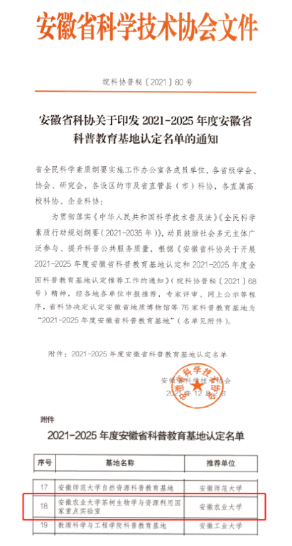 近日,安徽省科学技术协会下发《关于印发2021-2025年度安徽省科普教育基地认定名单的通知》,我室获批2021-2025年度安徽省科普教育基地。