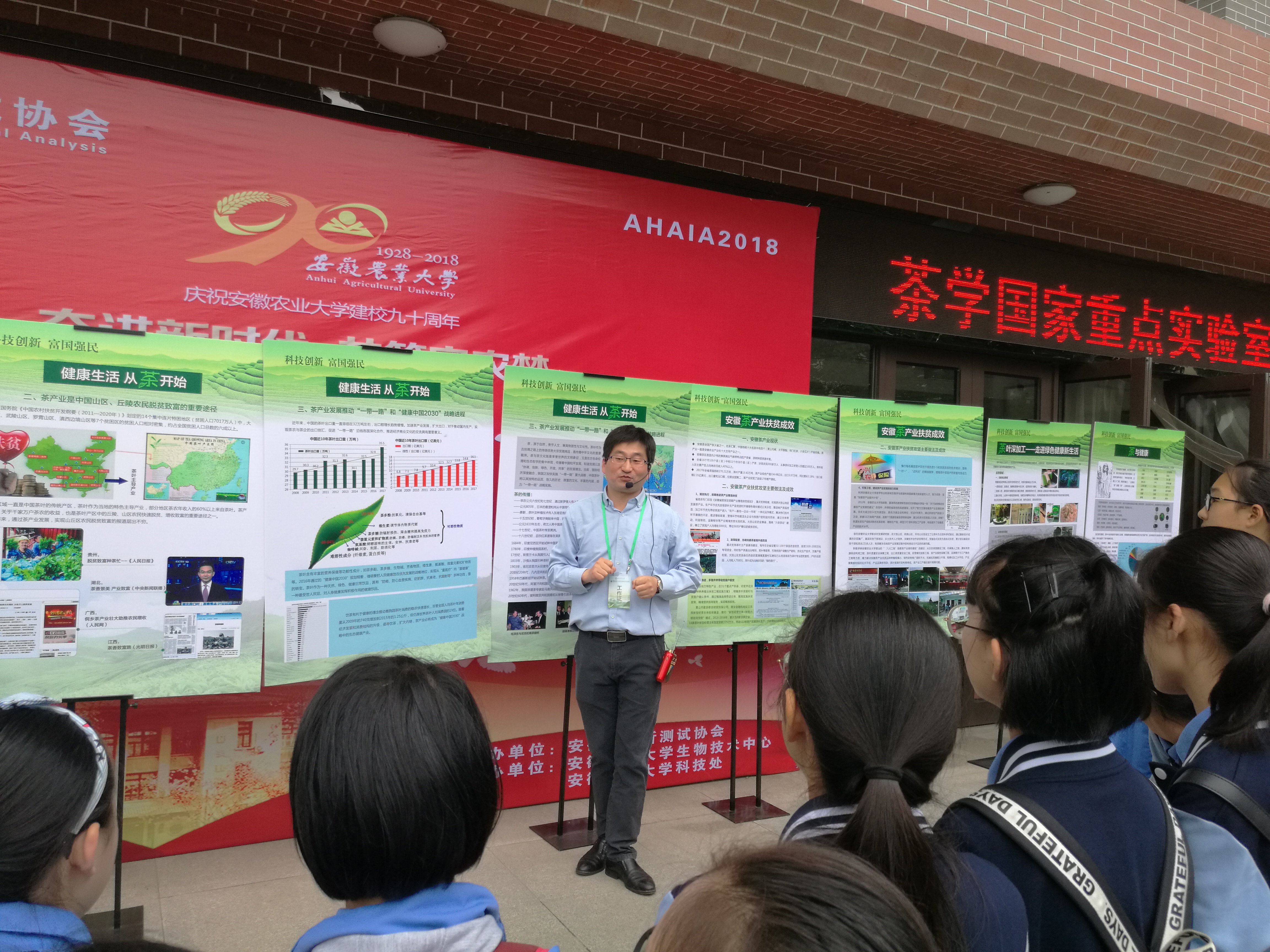 5月19-26日,为响应“科技创新,强国富民”为主题的2018年全国科技活动周和科普茶的知识,实验室于5月26日在生物科技楼举办了“2018年公众开放日暨第二届研究生联谊活动”,本次公众开放活动的主题是“健康生活,从茶开始”。实验室精心安排宣讲、茶产品介绍、名茶品鉴、茶艺表演等多个活动环节,吸引了合肥市的中、小学生、普通市民及我校师生共计250余人来室参观与体验。