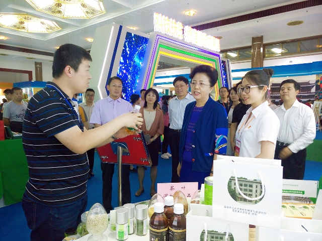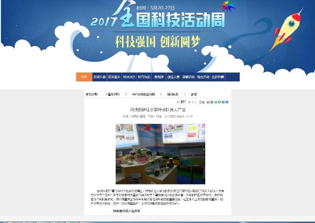 5月20-27日,以“科技强国、创新圆梦”为主题的2017年全国科技活动周暨北京科技周主会场活动在民族文化宫拉开帷幕。中共中央政治局委员、国务院副总理刘延东,中共中央政治局委员、中共北京市委书记郭金龙及相关部委领导出席了开幕式,刘延东宣布科技活动周启动。本次科技活动周,由我室提供的“一片小叶子,扶贫大产业”项目,作为科技部指定26个参展项目之一,在北京主会场的中心展区“科技扶贫,精准脱贫成果展”展出,并入选“2017年全国科技活动周暨北京科技周主场最受公众喜爱的科普项目”。