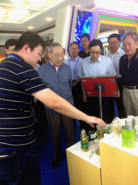 在观看工作人员现场演示我室自主研发的速溶茶系列产品,能在常温下迅速溶解于瓶装水,并保留了原有的茶风味,原中共中央政治局常委、国务院副总理李岚清连声说“好,好,好”。