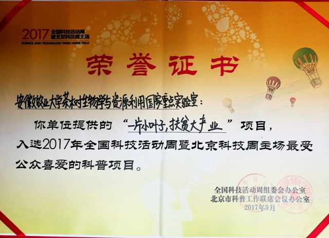闭幕式上,我室提供的“一片小叶子,扶贫大产业”项目,因有效地普及了茶叶科学知识,展示了科技扶贫、精准脱贫的最新成果,获得了科技部农村中心、参展人员、广大市民和媒体记者的一致好评和广泛热议,大会组委会经过评选,一致推荐入选“2017年全国科技活动周暨北京科技周主场最受公众喜爱的科普项目”。
