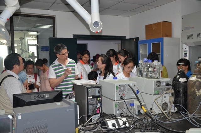 在对外开放的实验室公共平台上,研究生们也特意为参观者演示了茶叶科学研究过程,运用大型仪器(液相色谱仪、气质联用色谱仪、近红外光谱仪、高光谱仪)等分离鉴定茶叶化学成分及茶叶品质分析等科学实验内容。