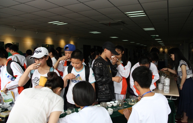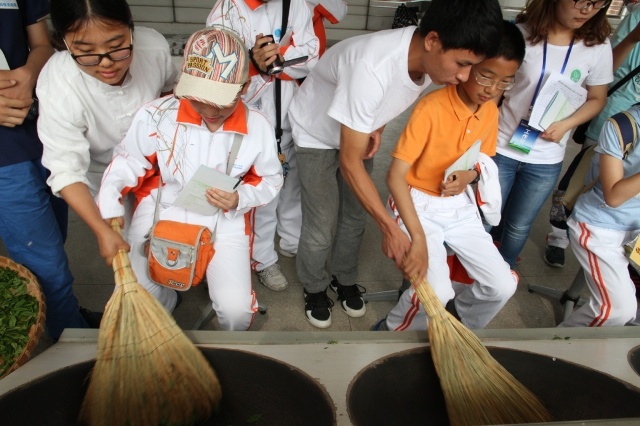 在实验室展厅西区,弥漫着茶叶的芳香。刚刚在2015年全国手工绿茶炒制大赛中荣获佳奖的茶学专业学生团队现场为参观者演示六安瓜片的加工工艺。初中生们聚精会神地看着,个个跃跃欲试,在志愿者的指导下,有模有样地炒制起来。
