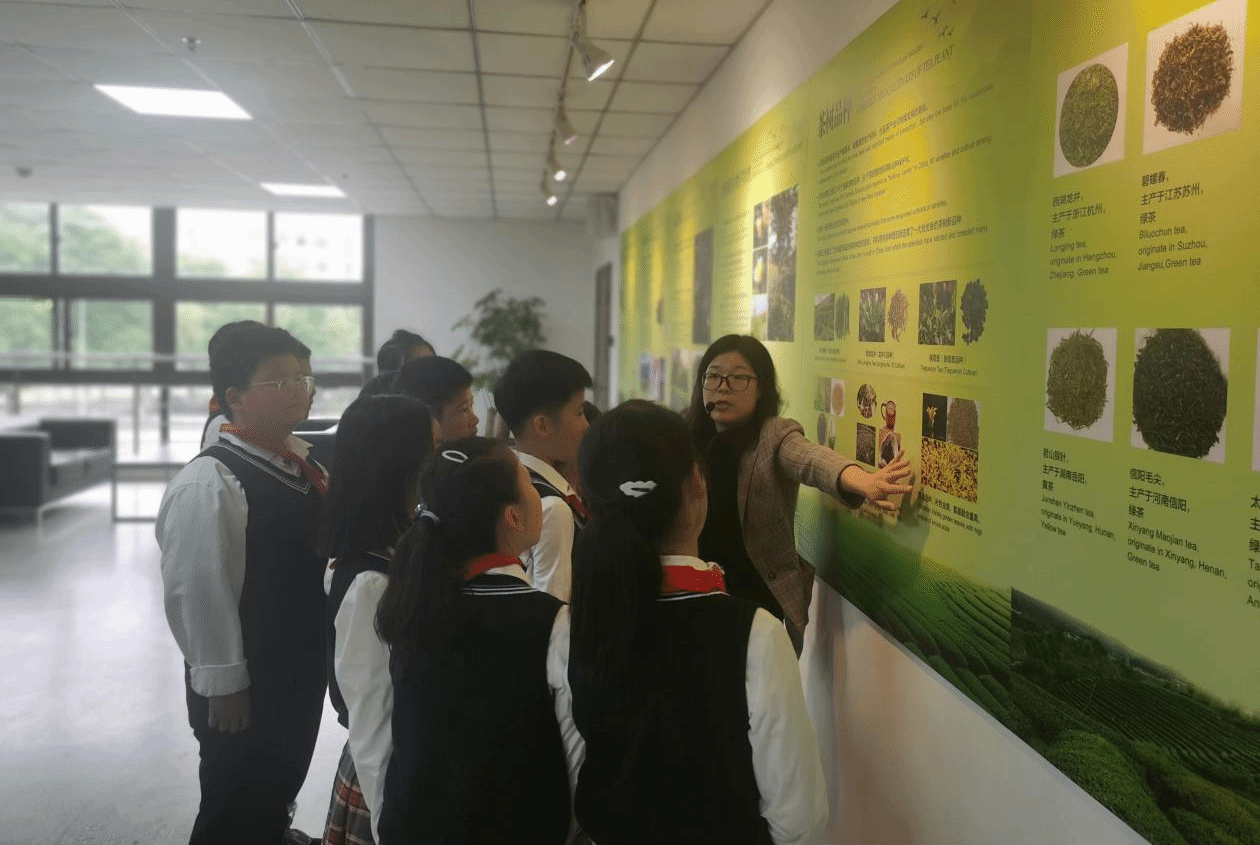 在实验室工作人员的带领下,同学们先在校教学示范基地进行了实地采茶活动,随后来到实验室学习了茶区分布、茶树品种、茶叶分类和茶叶加工等茶学专业知识。