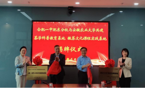 4月14日,实验室和合肥一中肥东分校共建茶学科普教育基地签约暨揭牌仪式在合肥一中肥东分校举行。党委常委、副校长李红,肥东县副县长王丽丹、省科协科普部二级调研员周庆、合肥一中教育集团副校长张大勇、合肥一中肥东分校校长蒋信伟、茶与食品科技学院院长李大祥、实验室常务副主任韦朝领等出席活动。签约暨揭牌仪式由合肥一中肥东分校副校长张建军主持。