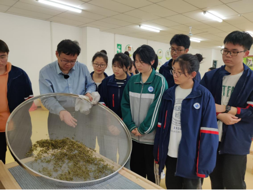 揭牌仪式后,李红一行在校园内参观了由茶树生物学与资源利用国家重点实验室指导建成的茶树品种园和制茶工作室。实验室宁井铭教授为合肥一中肥东分校师生演示了毛峰茶的加工过程,讲解茶叶加工要点、注意事项及手工茶背后的技艺与文化。
