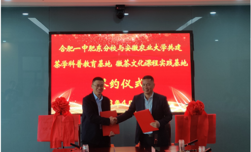 实验室专职副主任刘广金、合肥一中肥东分校校长蒋信伟代表双方签订了《共建茶学科普教育基地协议书》。