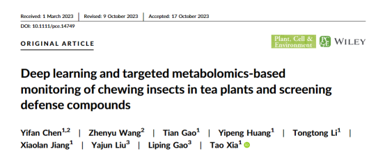 近日,安徽农业大学茶树生物学与资源利用国家重点实验室夏涛课题组Plant Cell & Environment在线发表了题为“Deep learning and targeted metabolomics‐based monitoring of chewing insects in tea plants and screening defense compounds”的研究论文,结合深度学习与靶向代谢组学监测茶园中茶树冠层水平受咀嚼式害虫为害的损伤程度,并从中筛选出潜在的防御性化合物,对可能的防御性化合物合成的相关基因做了功能分析。该研究为有效监测茶树害虫为害程度及筛选绿色防御化合物提供了重要的参考价值和应用前景。