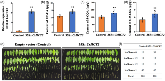 为了探索茶树咀嚼式害虫对EC-CA是否具有拒食效果,分别将表儿茶素的羟基肉桂酰基化产物EC-CA、没食子酰基化产物ECG以及底物EC分别涂抹到茶树叶片表面,引入灰茶尺蠖比较取食情况,结果显示相比较ECG和EC,灰茶尺蠖对EC-CA具有更明显的拒食性,表明EC-CA对茶树咀嚼式害虫具有一定的抑制效果。那么EC-CA是怎么合成的?根据文献报道,BAHD酰基转移酶家族Vb分支成员HCTs具有底物混杂性,可以催化羟基、胺基形成酯或者酰胺等物质,由此推测其也可催化表儿茶素的羟基肉桂酰基化形成EC-CA。组织表达差异与诱导表达差异显示CsHCTs与EC-CA的积累模式一致。体外酶学实验表明CsHCTs的确可以有效催化EC-CA的合成。通过基因的反义寡核苷酸实验表明咖啡酰莽草酸、绿原酸和表儿茶素咖啡酸酯都是CsHCTs的产物。通过农杆菌介导的茶树叶片瞬时遗传转化实验,分别将对照及含有目的基因的农杆菌注射到茶树枝条中,比较灰茶尺蠖的取食情况,结果显示瞬时过表达CsHCTs的茶树叶片中三种产物含量均增加,且受到灰茶尺蠖的取食更少,表明瞬时过表达CsHCTs的茶树叶片对灰茶尺蠖具有一定的抵抗效果。