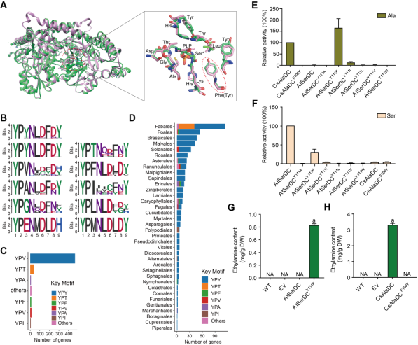 本研究解析了CsAlaDC和AtSerDC的蛋白结构,表征了底物结合口袋的结构特征。基于此,通过对CsAlaDC和AtSerDC的底物结合口袋中的氨基酸残基叠加,发现CsAlaDC第106位的Phe (F)在AtSerDC对应位置上是酪氨酸Tyr (Y),而口袋中其余氨基酸残基完全相同(图1A)。通过分析400多个有胚植物中的SerDC蛋白序列,发现CsAlaDC 106Y或AtSerDC 110F位于一个保守的功能域中,在绝大数同源蛋白中该功能域的前三个氨基酸是YPY,而CsAlaDC的这三个氨基为YPF(图1B-D)。进而,通过点突变及体内、体外酶活等实验证明了CsAlaDC中106位的Phe决定其结合丙氨酸的底物特异性。