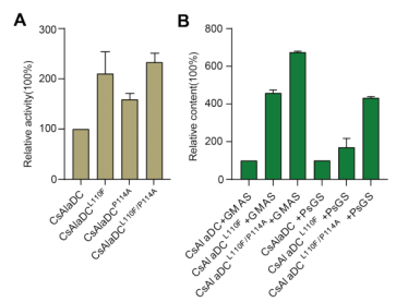 CsAlaDC或AtSerDC的蛋白结构为同源二聚体(图1A)。分析发现其同源二聚体结合界面上氨基酸对它们的催化活性至关重要。基于二聚体结合界面上氨基酸的突变筛选,发现把CsAlaDC二聚体界面上110位的异亮氨酸(L)、114位的酪氨酸(P)分别突变为SerDC对应位置上的苯丙氨酸(F)、丙氨酸(A),分别使CsAlaDC的催化活性提高了2.1和1.59倍。而这两个氨基酸同时突变(CsAlaDCL110F/P114A)时,催化活性提高了2.3倍(图2A)。更为重要的是,将CsAlaDCL110F/P114A与来自枯草芽孢杆菌的茶氨酸合成酶GMAS混合时,在提供丙氨酸和谷氨酸的条件下,体外合成茶氨酸的能力提高了6.72倍(图2B)。