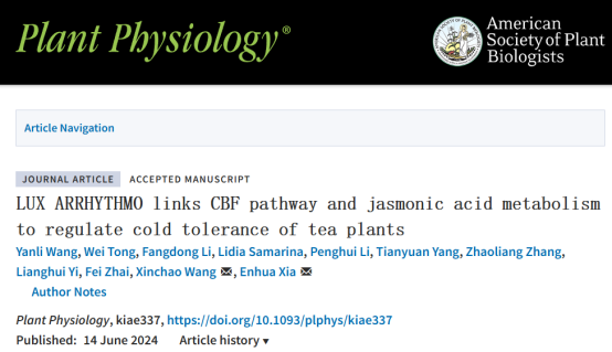 近日,国际植物学权威期刊Plant Physiology在线发表了安徽农业大学茶树生物学与资源利用国家重点实验室夏恩华教授团队题为“LUX ARRHYTHMO links CBF pathway and jasmonic acid metabolism to regulate cold tolerance of tea plants”的研究论文。该研究发现茶树昼夜节律基因CsLUX可整合CBF通路和茉莉酸代谢应答茶树低温胁迫的新机制。