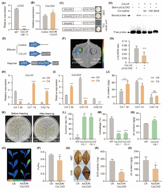 图2. CsLUX调控CsLOX2表达和JA含量应答茶树低温胁迫