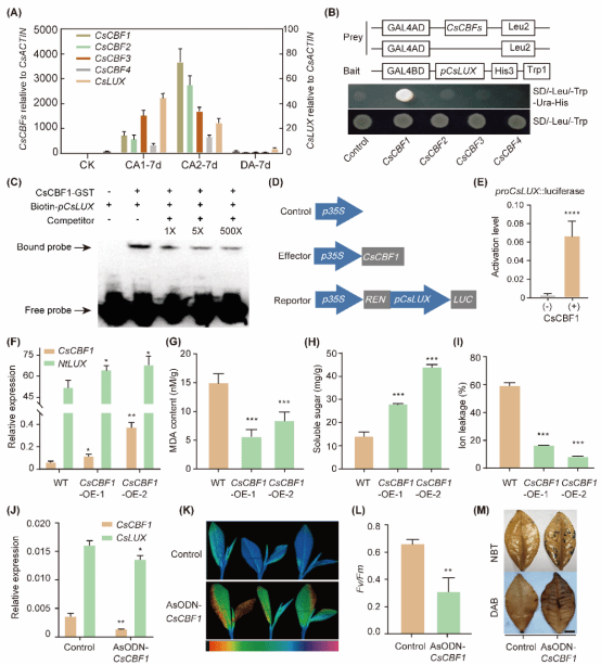 图3. CsCBF1结合CsLUX启动子并激活其表达正调控茶树抗寒
