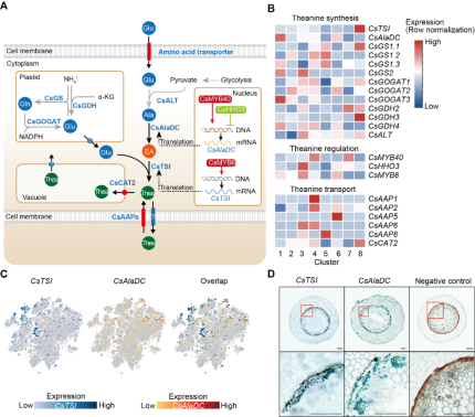 然后,该研究分析了茶氨酸生物合成、储存和转运的细胞类型特异性(图2)。分析表明,不同类型细胞的氨基酸合成类型和能力不同,茶树根系活跃的谷氨酸和丙氨酸代谢为茶氨酸的大量合成提供可能。茶氨酸合成的核心基因CsAlaDC 和CsTSI 的表达在不同细胞类型中富集:CsAlaDC在形成层或木质部相关细胞中高表达,CsTSI在中柱鞘细胞中高表达。这种细胞类型差异表达表明,茶氨酸及其前体乙胺的合成可能存在空间隔离调控。