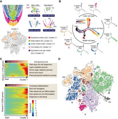 该研究利用10X单细胞转录组测序(scRNA-seq)技术,捕获了10,435个高质量的茶树根细胞,根据基因表达模式把这些根细胞分为8个细胞簇(Cluster)。随后,利用细胞类型Marker基因、细胞簇富集差异基因、公共单细胞数据库等数据信息,结合in situ RT-PCR技术验证基因表达的细胞类型,注释了这些细胞簇的细胞类型。通过拟时序分析,构建了这些细胞簇的分化关系,验证了细胞簇注释的准确性(图1)。