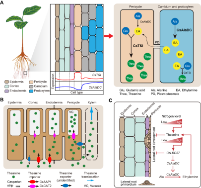 研究人员根据以上研究结果,总结了茶树根中茶氨酸合成、转运及其调控的细胞异质性模型(图3)。这些研究结果也为其它植物根特异的次生代谢研究提供了重要参考。
