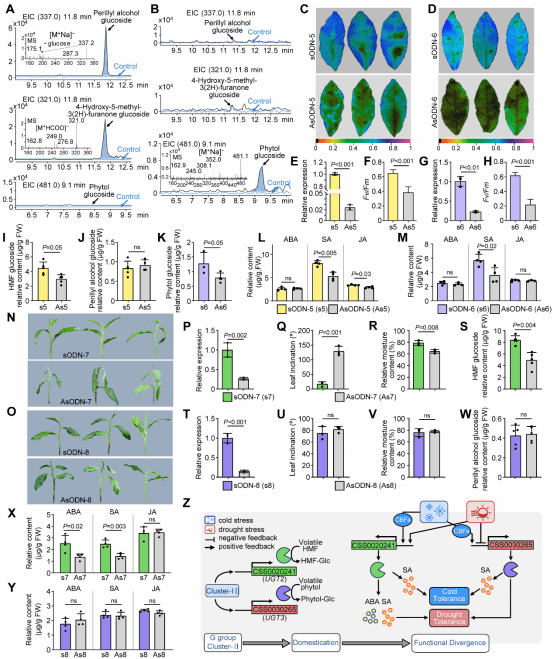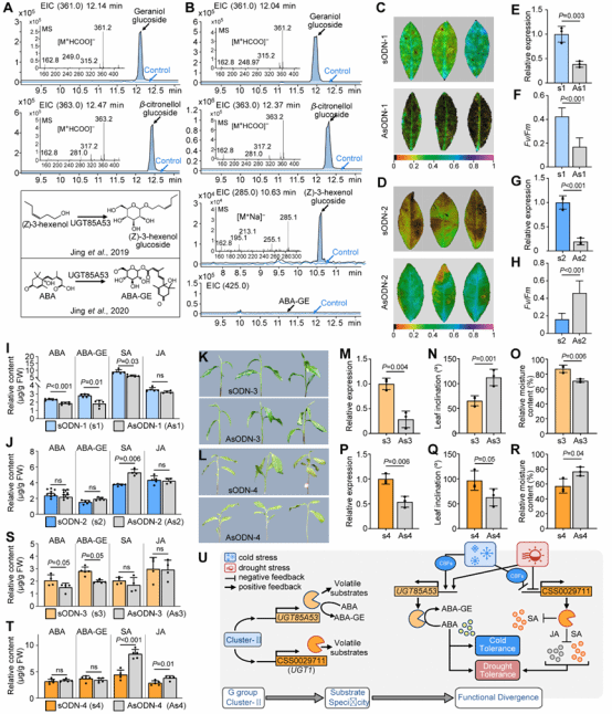 研究还进一步对野生型茶树(DASZ)和栽培茶树(‘云抗10号’和‘舒茶早’)的UGTs进行了比较分析,发现茶树G亚家族III-1为茶树‘舒茶早’品种特有分支。遗传多样性分析进一步发现,该分支中的许多UGTs经历了人工选择。特别地,III-1代表成员UGT3和III-2代表成员UGT2分别具有糖基化叶绿醇和呋喃酮的活性,表明二者在糖基化香气底物上表现出分化。进一步功能实验发现,UGT2可参与茶树的抗寒和抗旱,而UGT3仅能参与茶树的抗寒而非抗旱(图3),进一步证明G亚家族III中受人工选择的UGTs表现出抗寒性保守而抗旱性分化的功能差异。这些发现不仅为揭示了驯化过程中UGTs协同调控茶树香气品质与抗寒性的全新机制,也为其他园艺作物香气品质与抗性的协同选择提供新思路。