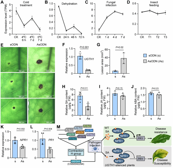 为此,该研究以28个代表性植物的基因组为切入点,在系统鉴定UGT的基础上,首先探索了茶树UGTs的扩增模式。研究发现,UGTs在茶树谱系中发生特异性地扩张和收缩。茶树中UGTs家族成员众多,共包含297个拷贝。根据其结构和底物偏好性可分为18个亚家族(A-R),其中UGT76隶属于H亚家族,该亚家族在不同茶树品种中呈现显著收缩的状态,特别是在茶树‘舒茶早’品种中仅保留了一个拷贝(UGTH1)。功能试验证实该拷贝与茶树真菌病害的抗性密切相关,暗示着H亚家族在茶树中仍保留了其它植物中保守的抗病功能(图1)。