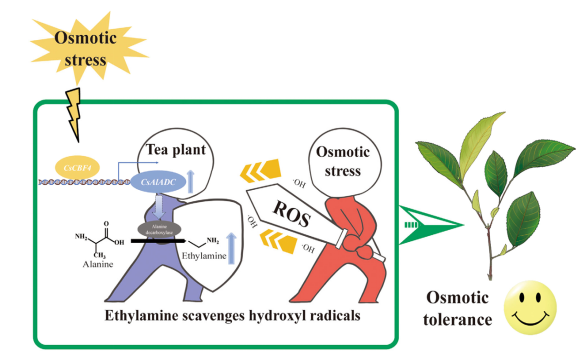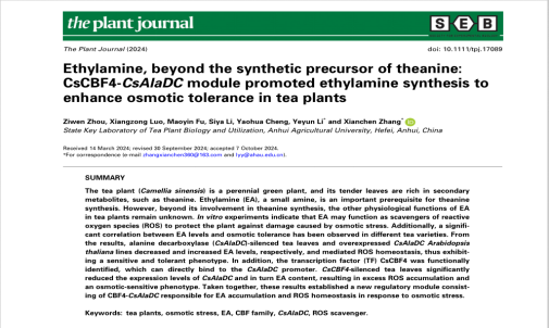 2024年10月30日,安徽农业大学茶树生物学与资源利用国家重点实验室李叶云团队在Plant Journal在线发表了题为“Ethylamine, beyond the synthetic precursor of theanine: CsCBF4-CsAlaDC module promoted ethylamine synthesis to enhance osmotic tolerance in tea plants” 的研究论文。乙胺(ethylamine,EA)是茶氨酸合成的重要前体,但是其在茶树中的其他生理功能尚未被深入研究。本研究表明,EA可以通过清除渗透胁迫下茶树产生的过量羟自由基来维持ROS稳态,可能在茶树的渗透胁迫反应中扮演着关键角色。