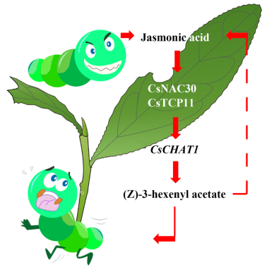 进一步基于转录组分析结果,鉴定到两个与CsCHAT1表达量显著正相关的转录因子CsNAC30和CsTCP11。基于DNA-蛋白质相互作用、基因沉默和代谢物含量测定等试验发现,CsNAC30和CsTCP11均能通过正调控CsCHAT1表达,促进3-HAC在茶树叶片中的积累,并提高茶树对茶尺蠖的取食抗性;同时,外源喷施JA和3-HAC的试验发现,JA可能是影响CsNAC30和CsTCP11正调控3-HAC生物合成量增加的主要激素信号分子。