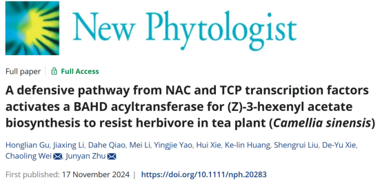 2024年11月17日,实验室韦朝领团队的青年教师朱俊彦等在《New Phytologist》期刊在线发表了题为“A defensive pathway from NAC and TCP transcription factors activates a BAHD acyltransferase for (Z)-3-hexenyl acetate biosynthesis to resist herbivore in tea plant (Camellia sinensis)”的研究论文,该研究揭示了乙酸叶醇酯参与茶树抵御茶尺蠖取食的分子调控机制,为抗虫茶树品种选育与害虫绿色防控技术开发提供了重要候选基因和理论依据。