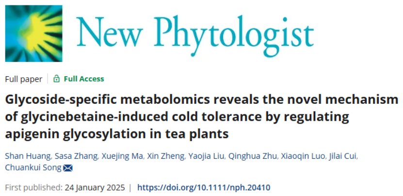 近日,安徽农业大学茶树种质创新与资源利用全国重点实验室宋传奎教授团队在《New Phytologist》期刊在线发表了题为“Glycoside-specific metabolomics reveals the novel mechanism of glycinebetaine-induced cold tolerance by regulating apigenin glycosylation in tea plants”的研究论文。该研究开发了一种利用锥孔电压诱导源内裂解的糖苷特异性代谢组学方法,揭示了甜菜碱(GB)通过调节芹菜素糖苷化诱导茶树耐寒性的新机制,拓宽了对糖苷化在植物抗寒作用的理解。