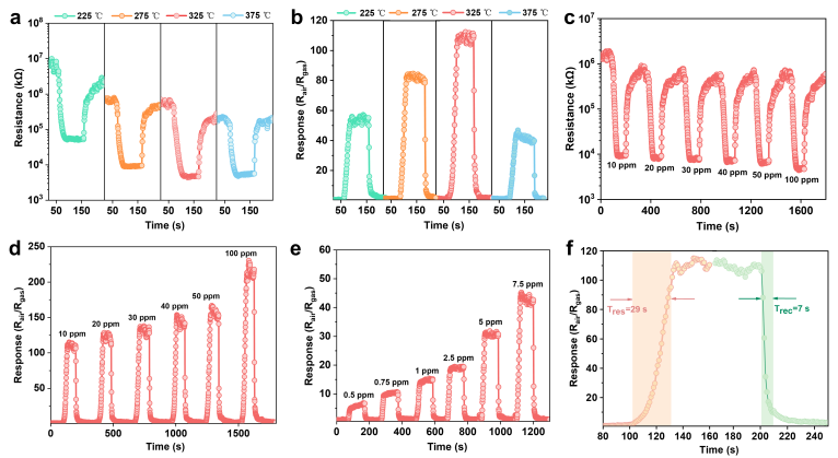 本研究通过制备一种氧化锌(ZnO)半导体气体传感器,实现叶醇、香叶醇、癸醛、辛醇、苯乙醇和水杨酸甲酯等挥发性香气物质的高灵敏检测。其中,该传感器对叶醇表现出极高的气敏响应。在325 ℃的工作温度下,对10 ppm叶醇的气敏响应值高达110,传感器的响应/恢复时间分别为29/7 s,最低检测限为0.5 ppm。此外,该ZnO半导体气体传感器具有良好的循环稳定性和长期稳定性。