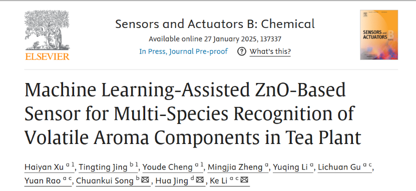 近日,我校信息与人工智能学院李科教授联合茶树种质创新与资源利用全国重点实验室宋传奎教授等团队合作在传感器类期刊《Sensors and Actuators B: Chemical》发表了题为“Machine learning-assisted ZnO-based sensor for multi-species recognition of volatile aroma components in tea plant” 的研究论文。该论文首次报道利用半导体气体传感器阵列技术,结合机器学习算法,实现多物种茶树挥发性香气物质的种类识别和浓度预测,为茶叶品质的鉴定和茶树病虫害的早期预警与智能防治提供关键技术方法。