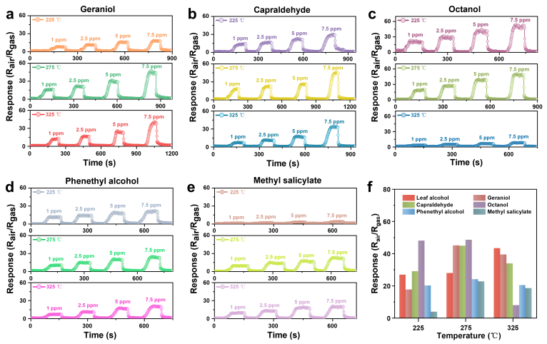 图2. ZnO半导体气体传感器在不同工作温度下对香叶醇、癸醛、辛醇、苯乙醇和水杨酸甲酯等挥发香气物质的气敏响应测试。