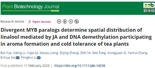 近日,实验室李鹏辉教授联合夏恩华教授团队在《Plant Biotechnology Journal》期刊在线发表了题为“Divergent MYB paralogs determine spatial distribution of linalool mediated by JA and DNA demethylation participating in aroma formation and cold tolerance of tea plants”的研究论文。该研究鉴定了茶树花和叶片中调控芳樟醇合成的MYB转录因子,解析了这些MYB转录因子与MYC2和JAZ蛋白协同参与茶叶加工过程以及茶树抵御冷胁迫过程分子机制,此外还发现DNA去甲基化途径作用于这些MYB转录因子,参与冷胁迫下芳樟醇的合成调控。