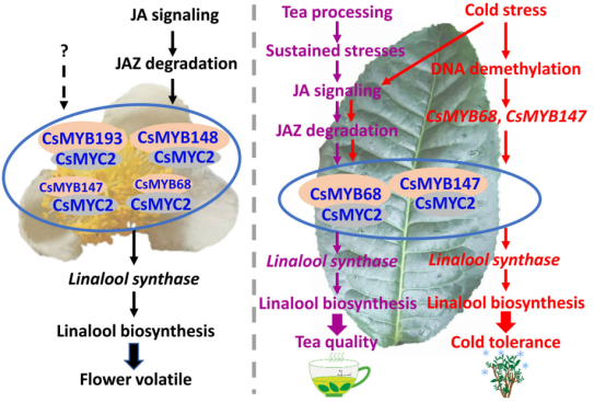 在茶叶加工早期阶段,如萎凋阶段,芳樟醇的合成被诱导。进一步分析发现萎凋阶段CsMYB68/CsMYB147表达以及JA合成和信号转导途径被激活,并结合JA合成抑制剂处理等实验,初步证明了萎凋过程中芳樟醇的诱导合成部分依赖于JA途径。芳樟醇在茶树应对冷胁迫过程中也发挥重要作用,本研究发现在冷胁迫下CsMYB68/CsMYB147可以整合JA信号转导和DNA去甲基化途径,促进芳樟醇合成,从而提高茶树抗寒性。这些研究结果为理解茶叶品质形成以及茶树抵御冷胁迫提供了理论基础。
