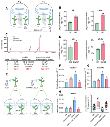 图1. DMNT预暴露增强茶树对茶尺蠖幼虫的抗性依赖于JA信号通路
