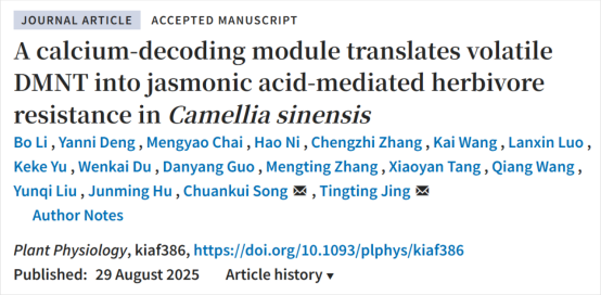 本网讯:近日,安徽农业大学茶树种质创新与资源利用全国重点实验室宋传奎教授团队在国际著名期刊Plant Physiology上发表题为A calcium-decoding module translates volatile DMNT into jasmonic acid-mediated herbivore resistance in Camellia sinensis的研究论文。首次揭示茶树释放的挥发性物质(E)-4,8-dimethyl-1,3,7-nonatriene (DMNT)可作为一种信号分子,触发茶树叶肉细胞Ca2+内流,通过激活Ca2+-CAMTA3-WRKY70-LOX3信号级联,促进茶树茉莉酸(JA)积累,最终增强受体茶树先发制人的抗虫能力。该研究不仅丰富对植物-植物 “化学通信”理论的认知,也为挥发性物质在茶园绿色防控中的实际应用提供重要理论依据。