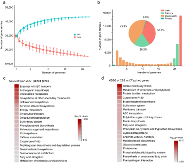 该泛基因组包含 15,216 个核心基因家族,占总基因家族的 35.1%,且当基因组数量超过 20 个时,核心基因数量趋于稳定,表明其具有很好的完整性。系统发育分析显示,野生茶树与栽培茶树约在 5.71 百万年前分化,而栽培茶树中的大叶种、小叶种及 白毛茶变种形成了清晰的遗传分支,为茶树起源与驯化研究提供了精准的时间标尺。