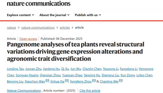 本网讯 近日,实验室韦朝领团队在《Nature Communications》期刊在线发表了题为“Pangenome analyses of tea plants reveal structural variations driving gene expression alterations and agronomic trait diversification”的研究论文。该研究通过构建 22 份代表性茶树及其野生近缘种的泛基因组,系统解析了基因结构变异在茶树驯化过程中对基因表达和农艺性状的调控作用,为茶树性状遗传机制解析与分子育种提供了新视角与全新的基因资源。