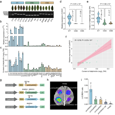 基于图形泛基因组对275份茶树种质的结构变异进行了基因分型。通过选择清除分析发现花青素合成酶基因ANS3启动子区域的结构变异,该区域存在3种单倍型:Hap1携带192bp插入,主要存在于野生近缘种;Hap2为缺失型(丢失192bp和283bp插入),主要存在于大叶种;Hap3携带283bp的插入,主要存在于小叶种,说明在茶树栽培驯化过程中Hap1逐渐丢失,而在栽培型的大叶种和小叶种中则经历了从Hap2向Hap3的转变。进一步的功能验证表明,野生近缘种中特有的192bp插入能够显著增强ANS3启动子活性,进而提高ANS3表达水平,使其花青素含量明显高于栽培种,这解释了野生近缘种茶树芽梢呈现紫色的原因。