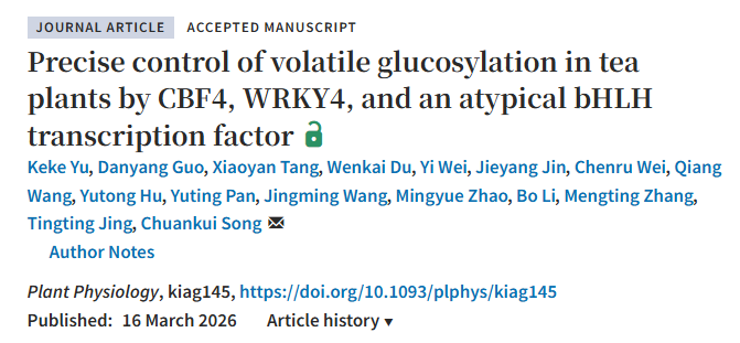 本网讯:实验室宋传奎教授团队在《Plant Physiology》在线发表题为“Precise control of volatile glucosylation in tea plants by CBF4, WRKY4, and an atypical bHLH transcription factor”的研究论文,首次揭示了茶树通过“油门-刹车”双重模块精准调控低温环境下重要香气物质橙花叔醇糖苷化过程的分子机制。