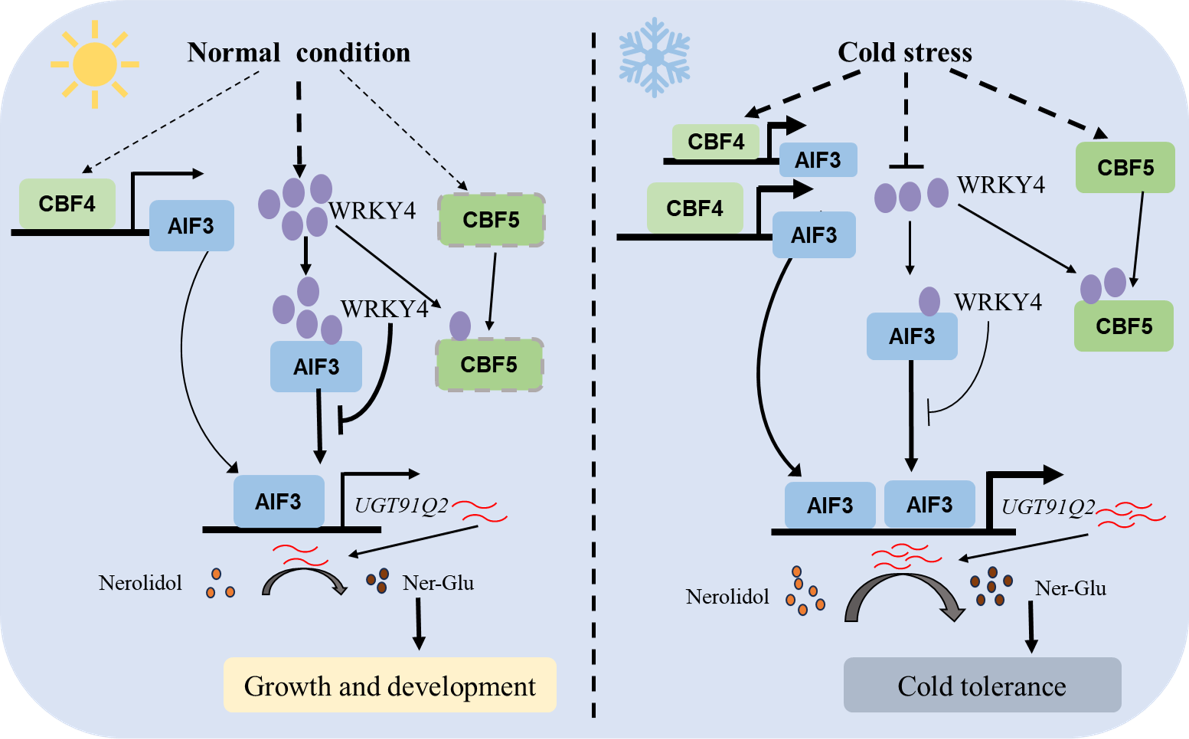 综上,茶树通过两条互补的途径精确调控香气糖苷合成及耐寒性:一是CsCBF4驱动的CsAIF3激活途径,二是CsCBF5介导的CsWRKY4抑制解除途径。二者协同,在低温条件下释放CsAIF3活性,激活CsUGT91Q2驱动橙花叔醇糖苷合成,最终增强植物的抗寒能力(图3)。该研究不仅揭示了DNA结合缺陷型bHLH转录因子的非经典功能,也为理解植物如何精确调控特化代谢以应对温度变化提供了关键见解。